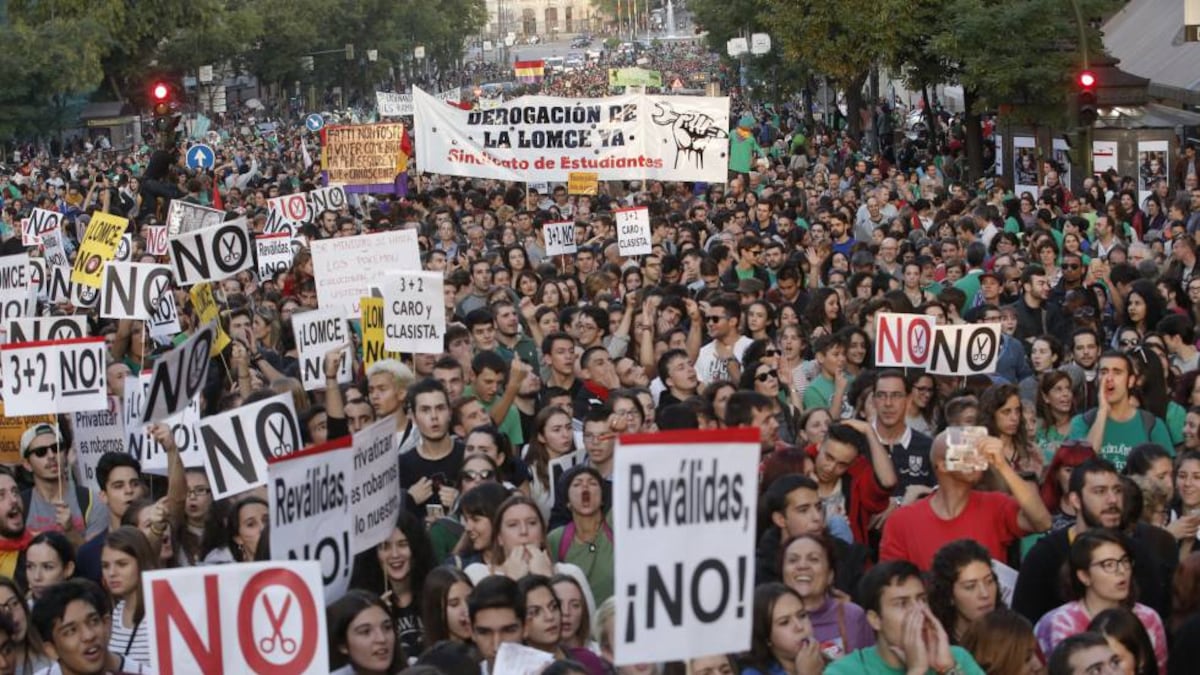 La Ley Orgánica para la Mejora de la Calidad Educativa (LOMCE) prevé unos exámenes externos para los alumnos de cuarto de ESO (15 y 16 años) y segundo de Bachillerato (17 y 18) que se implantan este curso como prueba piloto y que los estudiantes debían aprobar necesariamente a partir de 2018 para poder obtener el título y seguir estudiando. Son las repudiadas reválidas, contra las que el miércoles protestaron decenas de miles de personas en todo el país y que han despertado críticas hasta de las comunidades del PP.