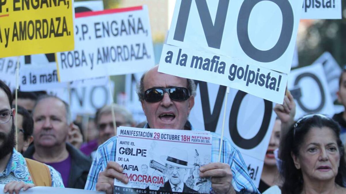 Los manifestantes portaban pancartas con mensajes como "No a la mafia golpista" y "ante el golpe de la mafia, democracia. No a la investidura ilegítima", el lema de la protesta, y han coreado cánticos propios del 15-M, como "No nos representan" o "PSOE, PP, la misma mierda es". El cántico de "No nos representan", característico de los indignados en 2011, ha vuelto a la calle a pesar de que Podemos, nacido precisamente de aquél movimiento de indignación, está ahora en las instituciones, con 71 diputados en el Congreso.