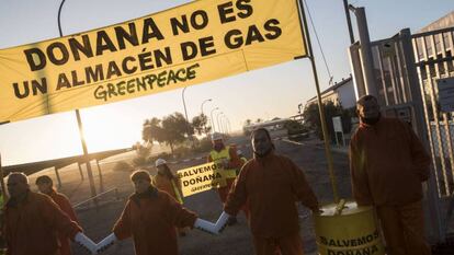 Una veintena de activistas de Greenpeace se ha encadenado esta mañana a las instalaciones de Gas Natural en el Parque Nacional de Doñana para frenar las obras de sus proyectos de extracción y almacenamiento de gas. En la protesta, iniciada de madrugada, los activistas se han encadenado para impedir la entrada de los operarios y otros, escaladores de la organización, han montado un campamento sobre una estructura, todos con pancartas que denuncian "Doñana no es un almacén de gas". La ONG ha instalado este "campamento de resistencia" contra las obras y de momento la Guardia Civil permanece a las puertas de las instalaciones sin intervenir.