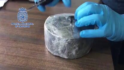 Los policías, ante la actitud nerviosa de este hombre y dado que no facilitaba datos coherentes sobre las sustancias que llevaba, procedieron a comprobar el interior del queso. De esta forma, descubrieron que estaba relleno de una sustancia que parecía ser cocaína por lo que el sospechoso fue detenido por la presunta comisión de un delito contra la salud pública.