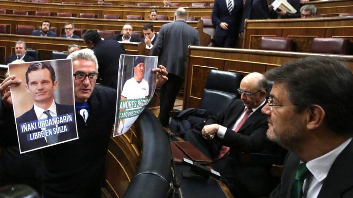 La Mesa del Congreso acordó el martes que el diputado de Podemos Diego Cañamero sea reprendido por Ana Pastor, presidenta de la Cámara, por acercarse al escaño del ministro Rafael Catalá en actitud intimidatoria portando dos carteles, uno con la imagen de Iñaki Urdangarin y otro con la del líder sindical encarcelado por agresión Andrés Bódalo. El diputado de Podemos pedía explicaciones por la libertad del primero y la prisión del segundo. Cañamero ha esgrimido su libertad de expresión y ha advertido de que seguirá haciendo cualquier cosa que esté dentro de la normalidad democrática.