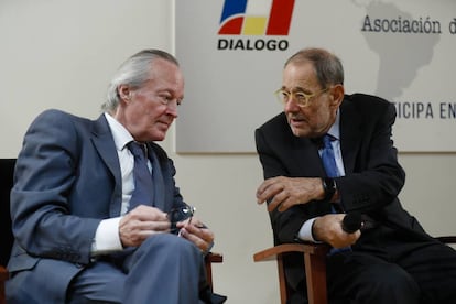 Cuatro exministros de Asuntos Exteriores, dos socialistas, Javier Solana (1992-99) y Miguel Ángel Moratinos (2004-10), y dos populares, Josep Piqué (2000-02) y José Manuel García-Margallo (2011-16), han coincido este lunes en destacar el papel central que jugó el Rey en el regreso de España a la escena internacional tras el largo ostracismo al que le condenó la dictadura. Lo hicieron en el debate organizado en Madrid por las fundaciones Diálogo y Carlos de Amberes y la Asociación de Periodistas Europeos sobre la Corona en la Política Exterior de España; aunque sería más exacto decir sobre la irrepetible figura de don Juan Carlos. "Resolvóa crisis levantando el teléfono y el Ibex 35 debería hacerle la ola porque, sin él, muchos grandes contratos no se habrían conseguido", aseguró Moratinos.