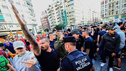La bronca se desató al inicio de la marcha. Los simpatizantes de la CUP y Arran fueron rodeados por decenas de personas que participaban en una contramanifestación que no contó con los permisos de la Delegación del Gobierno en la Comunidad Valenciana. Se sucedieron los incidentes entre simpatizantes de la extrema derecha y la izquierda independentista, algunos de cuyos miembros sufrieron golpes y amenazas por parte de los primeros. En la refriega, un colaborador gráfico de EL PAÍS ha sido agredido por los ultras.