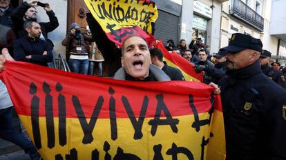 Una escena que se repite. Ya ocurrió la pasada semana, cuando otro grupo se plantó a unos 100 metros de la Audiencia Nacional ante la citación de los exmiembros del Govern, que acabaron encarcelados. Y también sucedió solo dos días antes, cuando los exconsellers Joaquim Forn y Dolors Bassa aterrizaron en el aeropuerto de Barcelona procedentes de Bruselas. Con gritos de "traidores" y "perros" los recibió una docena de personas, que esperaron con las banderas escondidas hasta que los imputados aparecieron en la terminal.