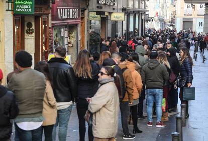 A las cuatro y media de la tarde la fila de Doña Manolita ya serpenteaba unos 100 metros y daba la vuelta a la manzana. El frío y la espera eran un enemigo que no todos estaban dispuestos a enfrentar. Nieves Gómez, de 58 años, cose redes en la localidad gallega de Cangas de Morrazo y está de vacaciones. Pero tiene una tarea pendiente: sus amigos quieren lotería y le han encargado buscar la suerte en el centro de Madrid. La perspectiva de una larga espera la frena. Saca el móvil, graba la cola y se la manda a sus amigos para justificar su deserción sin cumplir el encargo. Y justifica: “Es normal que le toque a ella [en el establecimiento de la famosa lotera ya fallecida] porque vende muchísimo”.