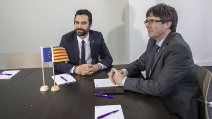 Los caminos de Puigdemont hacia la presidencia de la Generalitat aparecen bloqueados. La investidura presencial aboca al expresident a la detención nada más pisar España. La telemática a distancia, ya ha sido rechazada por los letrados del Parlament. Ajeno a esas dificultades, con el reloj corriendo hacia la fecha límite del 31 de enero, Puigdemont ha mantenido este miércoles todas las puertas abiertas a la salida de la reunión con el nuevo presidente del Parlament, Roger Torrent, desplazado hasta Bruselas para entrevistarse con él. "La investidura ideal es la presencial", dijo Puigdemont. "Pero hay otros caminos y no descartamos ninguno", afirmó sin concretar cuáles.