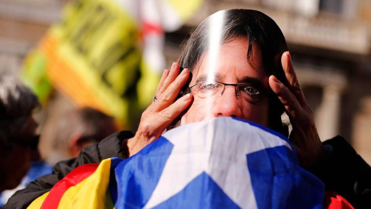 Un hombre con una máscara que representa a Carles Puigdemont este martes en Barcelona. / Vídeo: Tensión en las inmediaciones del Parlament entre unionistas e independentistas.Foto: atlas | Vídeo: PAU BARRENA (AFP)