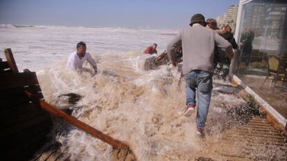 Agentes de la Policía Local de Lepe (Huelva) han auxiliado este jueves a un conductor que quedó atrapado en la playa de La Antilla por la crecida del mar ocasionada por el temporal. Las fuertes olas sorprendieron al conductor, que abandonó el vehículo al comprobar que no podía continuar. Varios ciudadanos y agentes le ayudaron a recuperar el vehículo antes de que fuera engullido por el mar. (EP)