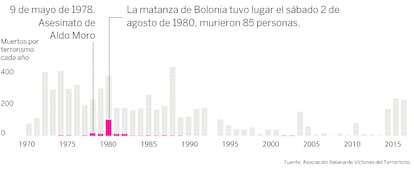 Entre los sesenta y los ochenta, Italia fue golpeada repetidamente por bandas terroristas. Las Brigadas Rojas (Brigate Rosse), con 83 víctimas mortales, y los NAR (Nuclei Armati Rivoluzionari), con 93, fueron los que mayor repercusión obtuvieron. Las Brigadas Rojas fueron fundadas a finales de los sesenta. Con una ideología de extrema izquierda pretendían socavar el sistema italiano. Llegó a contar con cerca de medio millar de militantes, y su declive comenzó tras el secuestro y asesinato del dos veces primer ministro y presidente de Democracia Cristiana, Aldo Moro, en marzo de 1978.