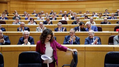 Los líderes populares en el Senado, José Manuel Barreiro y Javier Arenas, se acercaron al escaño de la ministra a darle la bienvenida con exquisita cortesía, pero fue como el saludo protocolario un minuto antes de que empiece un partido de hockey sobre hielo. El bullicio hooligan y faltón del PP se desató en cuanto Montero comenzó a hablar. Por momentos había un ruido con eco difuso, como de gimnasio o cancha escolar, y costaba escucharla. Pío García-Escudero permanecía instalado en esa especie de modorra institucional o trance narcoléptico que debe de transmitir la butaca de la presidencia del Senado. Dejaba hacer a los chicos. Si acaso llamó la atención a los del PSOE cuando contestaban. Luego ya se calmaron los ánimos. Sus señorías se fueron dando cuenta de que todo esto en el fondo no era tan divertido, y mucho menos que va a ser. Al cabo de una hora el hemiciclo ya estaba medio vacío, como en un debate serio cualquiera.