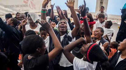 Único barco en la zona. Lo único que sabe el nigeriano Mechi, de 29 años, es que Valencia tiene algo que ver con el fútbol, su gran pasión. Es uno más de los miles de chavales que cruzan a Europa con el sueño de vivir de los goles. Cuenta que trabajó ocho meses en una granja a cambio de comida, techo y una tarjeta SIM. Nada más. “Tengo una SIM”, dice con una sonrisa. Un tesoro. Los huéspedes del barco están desconectados del mundo, sin móvil, batería o internet. Cuenta que “una fatídica noche, un viernes” su dueño le dijo: “Me has servido suficiente”. Y lo cuenta como si declamara. Aquel hombre lo llevó a la costa. “Me encontré frente al mar”. Le dijo que iba para Italia. ¡Estaba tan contento y tan asustado. Nunca había visto tanta agua! Zarparon a las cuatro y media. “Pensé que nos encontrarían pronto, pensé que nos rescatarían. Pero no, vino un pesquero libio que nos dijo que siguiéramos”. Continuaron. Hasta que el Aquarius, el único barco e una ONG en la zona aquel día, supo de ellos y les llevó del mar que ya ha engullido este año a 784 migrantes por lo menos. “Esta es mi historia. Estoy muy feliz”.