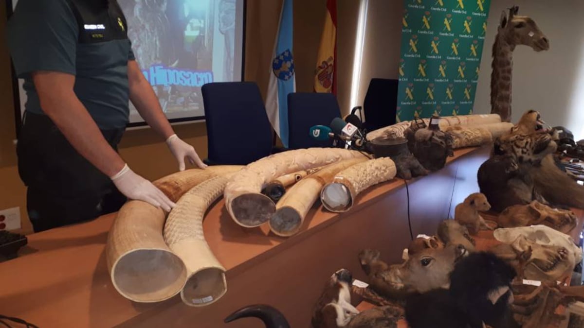 En el botín destacan 11 colmillos de marfil, algunos de ellos tallados, cuyo valor en el mercado puede superar los 100.000 euros. También aparecen en el lote otras piezas de incalculable valor para los expertos como los ejemplares completos de varios animales, entre ellos un leopardo de las nieves, un león, un tigre y el cuello de una jirafa.