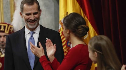 El acto celebrado en el Congreso, al que, junto a los Reyes, asistieron don Juan Carlos, doña Sofía, la princesa Leonor y la infanta Sofía, transcurrió con normalidad, solemnidad y sin el menor incidente, a pesar del habitual clima de tensión política que soporta el hemiciclo. Los diputados de Unidos Podemos se limitaron a no aplaudir a los Reyes y a exhibir un pin alusivo a la República para manifestar su exigencia de reforma constitucional y su posición contra la Monarquía. El Rey, que terminó su discurso con un agradecimiento en las cuatro lenguas del Estado, afirmó que “la Corona está ya indisolublemente unida —en la vida de España— a la democracia y a la libertad”.