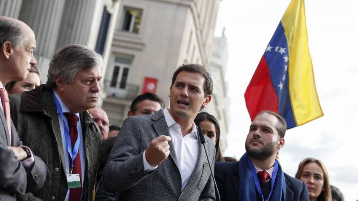 Rivera se ha concentrado esta mañana con el padre de Leopoldo López y varias decenas de opositores venezolanos frente a las escalinatas del Congreso, mientras Pablo Casado estuvo el miércoles en la manifestación de contrarios al chavismo en la Puerta del Sol de Madrid. Los dos partidos que se disputan el centro derecha presionan al Gobierno de Pedro Sánchez, a la vez que compiten por liderar el apoyo a la oposición venezolana a Maduro.