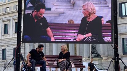 Antes de ese diálogo entre Bayona y Carmena, se proyectó el primer vídeo de la campaña, denominada La democracia se toca. En el cortometraje, la popular plaza del Dos de Mayo, en Madrid, sirve de escenario para una conversación entre la periodista Lucía Méndez y la escritora Gabriela Ybarra. Tomando como punto de partida el terrorismo de ETA, que asesinó al abuelo de Ybarra a finales de los setenta, el político y empresario Javier Ybarra, las dos protagonistas del vídeo reflexionan sobre la importancia de la libertad de expresión. “Si ETA se ha terminado es en gran medida porque la sociedad ha ido rechazándola”, analiza la escritora vasca. “Todos los acontecimientos desde la Transición demuestran que la democracia y las leyes amparan a todos, no solo a los que las respetan, sino también a quienes no las respetan”, añade Méndez.