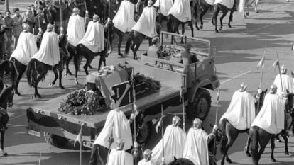 Traslado del cortejo con los restos mortales de Franco al Valle de los Caídos cubierto con una bandera del Águila de San Juan. En vídeo, las claves de la exhumación de Franco.Vídeo: EFE / EPV