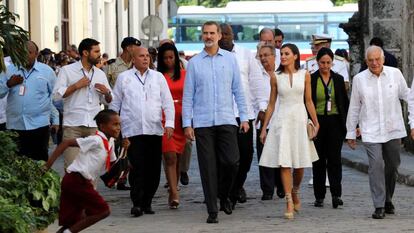 Los gritos de “¡Viva el Rey de España!” y “¡Bienvenidos a La Habana!” se han escuchado en la capital cubana. Felipe VI ha podido pasear por el casco antiguo de la ciudad, saludado efusivamente por turistas y vecinos, como no pudo hacerlo hace 20 años su padre, Juan Carlos I, cuando acudió a la Cumbre Iberoamericana de La Habana en medio de fuertes tensiones entre Fidel Castro y José María Aznar. Tras el recibimiento oficial, los Reyes se pusieron ropa cómoda (de guayabera, él; vestido blanco ella) para caminar desde la plaza de la Catedral a la de Armas, rodeados de un fuerte cordón de seguridad que mantenía a raya a los curiosos. El paseo no estaba previsto y causó la sorpresa de los viandantes, que se acercaron espontáneamente a saludarles y hacerles fotos.