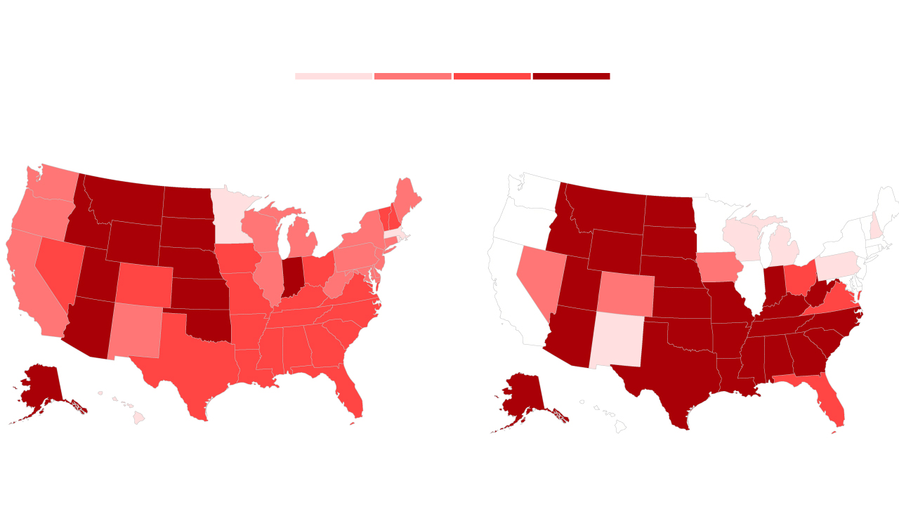 Aunque hayan perdido las elecciones, los republicanos están en buena racha en varios Estados. El partido encadena tres comicios consecutivos creciendo en 12 Estados, aunque también suman tres elecciones seguidas mermando en Maryland. De esos 12 territorios, el mayor crecimiento acumulado se registra en Virginia Occidental (+12,9 puntos), seguido de Dakota del Norte (+11,8) y Iowa (+9).
