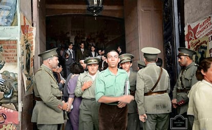 La foto que Walter Reuter va fer a Miguel Hernández, lliure de càrregues, mirant endavant fora de l’Ajuntament de València, es pot veure en una exposició al Palau de les Comunicacions