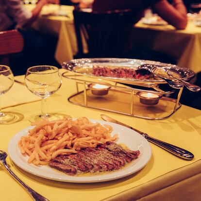 A L’Entrecôte, el menú és molt més senzill. Tant, que queda reduït a tres plats. De primer, una amanida amb quatre nous, generosament regada amb una vinagreta. De segon, un combinat que mai falla si teniu canalla o adolescents, però que, no ens enganyem, fa feliços a la majoria d’adults també: un filet del llom baix de vedella (raça Simmentalfinamente), que arriba a taula filetejat, acompanyat de patates fregides. Tallades primes i cruixents. D’aquelles vicioses. I a més, en podeu repetir tants cops com volgueu. Per completar-ho, una salsa secreta. I una llarga llista de postres. Si en voleu saber més, cliqueu aquí.