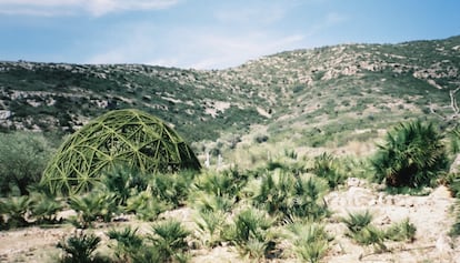A Desig i ficció s’expliquen les múltiples propietats del margalló citant sis articles científics d’etnobotànica recopilats pel biòleg Ugo d’Ambrosio: és font de cel·lulosa, hidròfug, té una alta capacitat de tracció, rebrota ràpidament després d’un incendi... També se l’explora com a ofici, enaltint els gestos manuals i les tècniques que les artesanes llatadores —com ara fan Magda Armengol i Cinta Subirats— han tramès de generació en generació. Però, sobretot, se l’explora com a paisatge. En aquest cas, Noguer i De Ubieta s’han inspirat en el Viver del Museu de la Pauma, un jardí a l’aire lliure als afores del poble on creix la planta (el margalló), que després es converteix en matèria prima (la pauma). L’ànima d’aquest ecosistema ha quedat encapsulada en un audiovisual de Bárbara S. Barroso, on apareixen altres plantes de la nostra bioregió, com el cotó del delta de l’Ebre i l’herba del pestell. Aquests minuts de poesia visual es poden contemplar drets o asseguts en un moble de fusta i pauma tractada (les fulles conserven el verd del margalló gràcies a un procediment que s’han inventat les mateixes comissàries) o en uns tamborets de fusta i formigó de pellofa d’arròs, un nou material sostenible creat per l’estudi d’arquitectura Cuadern Campanals. Les dues opcions de seient —senzilles i funcionals— juguen a fer entrar el paisatge a casa i mostren com la tecnologia i el disseny poden estalviar recursos i millorar la vida humana. Potser llegint això us ve al cap el nom del visionari arquitecte nord-americà Buckminster Fuller. Sobretot si us heu fixat en la fotografia que obre aquest article. Deixaré en l’aire si la cúpula vegetal del jardí de margallons és artesania de ficció, de tradició o de desig, perquè prefereixo que la veieu com una projecció de futur que ens alleuja i ens reconnecta amb allò que realment importa.