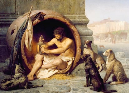 Diògenes el gos, com li deien, va viure en una bota —el diccionari (1695-1697) de Bayle discuteix si era una bota o una tina d’argila: això és un diccionari com cal—, no tenia res més que una túnica basta, una manta per al fred que també li feia de jaç, un fanal —amb què deia que “buscava un home”, sense que l’arribés a trobar mai—, i un vas de terra per beure aigua, del qual es va desprendre, per innecessari, el dia que va veure que un nen bevia fent un clos amb les mans. (Per això no té cap sentit parlar de la “síndrome de Diògenes” quan algú té la casa plena d’escombraries. Ell no tenia ni casa.) Quan li venien ganes de remenar-se-la, ho feia al mig del carrer sense manies; considerava tots els polítics uns bergants i totes les lleis una arbitrarietat: les seves lleis eren les de la natura, i això no deixava de consistir en un model de saviesa. No és estrany que Plató i Aristòtil se’n riguin als seus escrits, però Alexandre el Gran, que l’admirava i el va visitar, estava disposat a oferir-li el que volgués si es traslladava a la seva cort: “Només vull que t’apartis —va respondre Diògenes—, que em tapes el sol”.