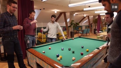 La única vez que vemos a alguien torcer el gesto es cuando pedimos a dos googlers que interrumpan su partida de billar para poder grabar una entrevista en la cafetería/sala de juegos. Se van educadamente, aunque con cara de rebotados (¡hemos perturbado su momento de relax!). Puede que vuelvan a sentarse al ordenador, a seguir desarrollando el próximo adelanto que cambiará nuestras vidas. O puede que se vayan a echar unas canastas.