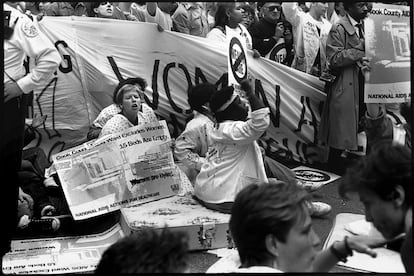 Ese activismo, cuenta le profesore, sirvió de base a un activismo más militante. En 1987 nació la organización ACT UP, siglas de AIDS Coalition to Unleash Power (Coalición para Desatar el Poder contra el Sida). “Era un activismo más frontal, tomó las calles de manera muy contenciosa”, relata Gould. Le experte relaciona este movimiento con una decisión del Tribunal Supremo de Estados Unidos tan solo un año antes. Los jueces resolvieron en 1986, en el caso Bowers versus Hardwick, que las relaciones homosexuales no estaban protegidas siquiera en el ámbito privado, y daba alas a los Estados para penalizar la homosexualidad. “La sentencia estaba escrita con odio, llena de homofobia. La gente se llenó de rabia y tomó las calles. Al principio iba solo de las relaciones gays y de poder tener sexo, pero la crisis del sida estaba sucediendo al mismo tiempo, morían personas a centenares y quedaba claro que la sociedad les prefería muertos. Varios opinadores incluso decían que había que crear campos de concentración para las personas gay con sida”, relata Gould. Y así surgió ACT UP.