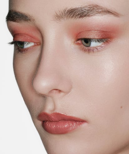 En el rostro, base de maquillaje Healthy Mix Anti-Fatigue Foundation; en los ojos, sombra Little Round Pot (11, Pink Parfait) aplicada con el dedo, y labios coloreados con el bálsamo Healthy Mix Lip Sorbet (04, Scoop’ink). Todo de BOURJOIS PARIS.