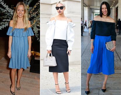 Los diseños más estructurados triunfan en los estilismos de noche mientras que en el día a día las blusas y vestidos vaporosos con elástico ganan la partida. Julianne Moore, Reese Witherspoon, Sienna Miller, Dakota Johnson o Emma Watson han sido embajadoras del primer grupo en las últimas alfombras rojas. Las street stylers de pro ya llevan meses apostando por la tendencia y su amor declarado por enseñar hombro va en aumento en las últimas semanas. Eva Chen (exdirectora de Lucky Magazine), Leandra Medine o la armada rusa (Miroslawa Duma, Anya Ziourova o Ulyana Sergeenko) son algunos ejemplos. Aunque donde verdaderamente se están destapando hombros a tutiplén es entre las egoblogueras.