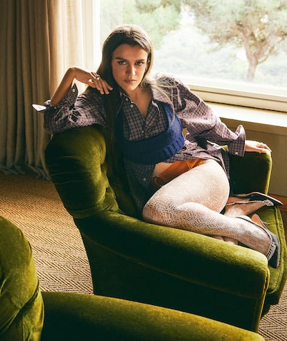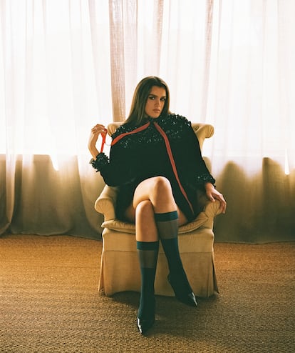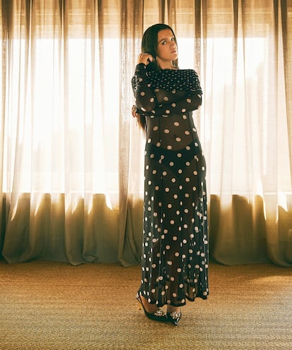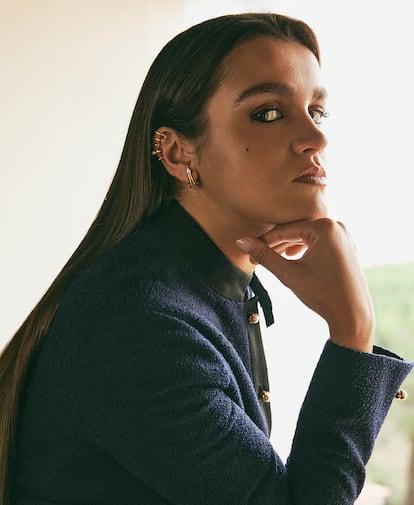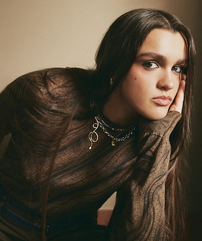 España ha vivido tres apagones este año. El eléctrico del 28 de abril. El que tuvo lugar el 7 de noviembre a las 17 horas, cuando Rosalía sacó el vídeo de Berghain. Y el 23 de febrero, cuando en el madrileño recinto Movistar Arena, Amaia logró que las 15.000 personas presentes permanecieran en silencio al comenzar a cantar Tengo un pensamiento. “Decidimos hacer las cosas al revés y comenzar la gira a lo grande. Estaba aterrada porque podía pasar cualquier cosa; estaba en un recinto inmenso mostrando a tantísima gente Si abro los ojos no es real, un disco lleno de canciones muy personales”, explica la cantante después de comer, inquieta por si tiene entre los dientes alguno traicionero trozo de comida. No los tiene. Filtros tampoco, pero sí una contagiosa ingenuidad y una naturalidad complicada de preservar siendo una mujer que con tan solo 26 años y tres álbumes a sus espaldas, ha revolucionado la historia de la televisión al sorprender en plena entrevista de La revuelta marcándose un directo en plano secuencia —inspirado en una entrevista en el telediario de Anne-Claire Coudray al cantante Stromae— con el que pasó del sofá a una calle aledaña a la Gran Vía junto a una banda y un coro. Curiosamente, cuando Rosalía protagonizó otro apagón (al final han sido cuatro) lo hizo también en el corazón de la capital, que paralizó y convirtió en la antesala de la presentación de Lux. “El disco de Rosalía se siente como algo histórico, la he admirado desde el principio”, dice la cantante, que es amiga de la catalana con la que comparte la virtuosa capacidad de cambiar las reglas del juego. “Para sorprender hay que tener la intención de hacerlo, pero lo que hagas tiene que ser sincero y ha de conectar de verdad contigo”.