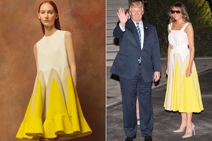 Las ocasiones en las que la primera dama estadounidense ha llevado la firma han generado muchos titulares tanto por el elevado precio de los diseños como por las críticas que han despertado algunos de ellos. El vestido de más de 2.000 euros que lució el pasado mes de agosto acabó por agotarse y, como recogía El País, el abrigo fucsia que llevó a un almuerzo de líderes mundiales en la ONU fue blanco de burlas por lo inapropiado del escenario elegido para llevarlo. La primera vez que apostó por la firma fue el pasado 7 de julio en su viaje a Polonia eligiendo un vestido azul y rosa de 2.500 euros. Desde Delpozo informaron que “se lo compró ella, no tenemos más datos. Es probable que en alguna tienda tipo Bergdorf Goodman o Saks”. Begoña Gómez, por su parte, ha hecho con esta elección un interesante alegato a favor de la moda española meses después de que la reina Letizia eligiera (por fin) un vestido de Delpozo.