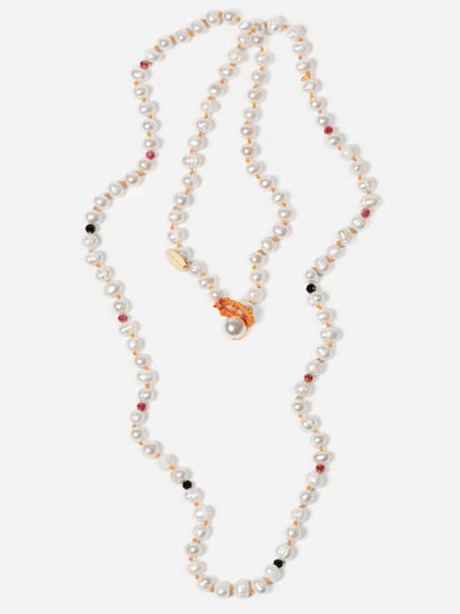 Las perlas se abren paso esta temporada con un de toque de color y diseños livianos como este collar qe piden varias vueltas al cuello, al estilo que lo popularizó en los años veinte Coco Chanel. Los pequeños nudos naranja se alternan con cuentas de cristal en negro y rojo para aportar más dinamismo a la pieza.