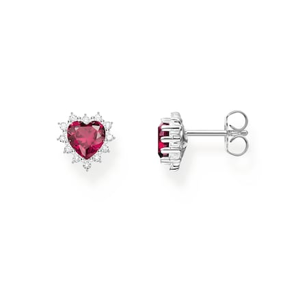 Dar un aire romántico a nuestra vestimenta será tan fácil como incluir este diseño de pendientes fabricados a mano con plata reciclada y un rubí tallado en forma de corazón con fincas circonitas blancas en el centro.
