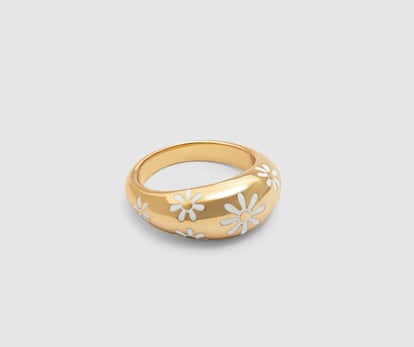 Su cuerpo abombado en latón con baño de oro de 18K y detalles de margaritas esmaltadas en blanco traslada a la estética Y2K al instante.