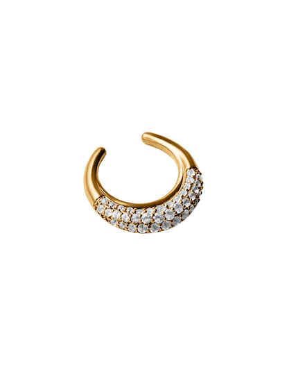 Dos piedras lunares, engarzadas sobre latón chapado en oro y rodeadas de circonitas, se adhieren a la fiebre por la slim jewellery en refinados diseños como este.