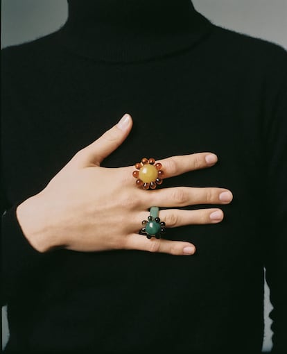 La diseñadora y actriz Mar del Hoyo renueva cada temporada esa seductora relación que mantiene el color, las formas orgánicas y el poder del vidrio borosilicato en sus anillos frente a la plata o el oro y que trabaja en su taller de Barcelona.