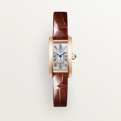 Diseñado por Louis Cartier en 1917, el tank es un objeto de culto para cualquier amante del lujo. Un reloj de pulsera que alía pura geometría y exactitud de las proporciones como señas de identidad en cada nueva variación. Es el caso de Américaine mini (en la imagen) con movimiento de cuarzo, una caja de oro rosa 750/1000 y una corona poligonal decorada con un zafiro facetado.