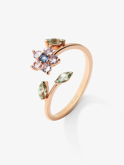 En 2022, la casa de joyería lanzó la colección de amuletos de Frida en homenaje a los rituales de México durante el Día de Los Muertos y a la pintora Khalo. Tal fue su éxito que sigue ampliando la familia con piezas como este anillo de oro rosa de 18kt con zafiros rosas, verdes y azules en talla brillante y marquise.