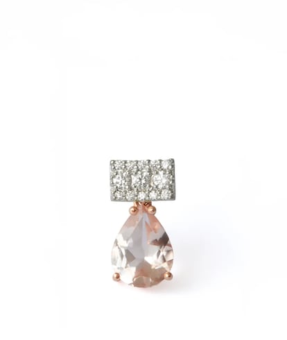 Esta pieza móvil, elaborada a mano por la firma española de alta joyería creada en 2018, cuenta con una placa de oro blanco engastada con diamantes y una delicada morganita rosa que simula una gota.