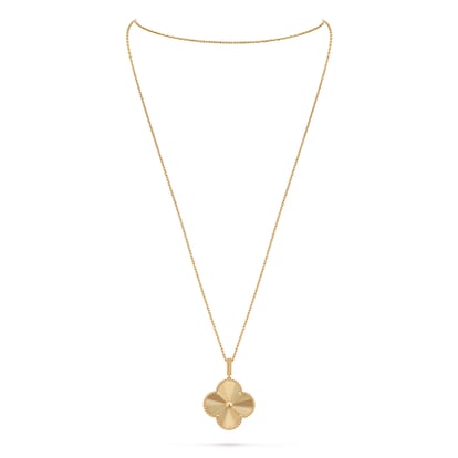 La colección Magic Alhambra® de la firma francesa arrancó en 2006 con la asimetría y la hoja de trébol como claves de su imaginario. Desde entonces, se transforma en multitud de piezas como esta gargantilla larga de oro amarillo y cierre de punzón, que se puede llevar al estilo sautoir o como un collar de dos vueltas.