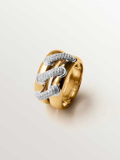 Puro romanticismo en una pieza que engarza los diamantes de varias tallas con el oro amarillo y blanco de 18 kt. Las fundadoras de esta marca asentada en el barrio de Salesas que ha revolucionado el concepto de alta joyería sostenible, destacan el particular desgaste de sus piezas para transportarnos hasta la época victoriana.