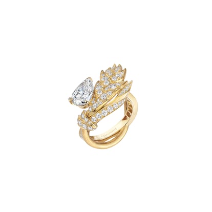 Perteneciente a la colección colección L’Épi de Blé de la joyera francesa, esta hipnótica pieza de 2kt redondea su magnetismo con oro amarillo y pavé de diamantes. En el plano formal, las espigas del trigo rinden tributo a las emperatrices Josefina y María Luisa al representar la riqueza y la abundancia de su reino.