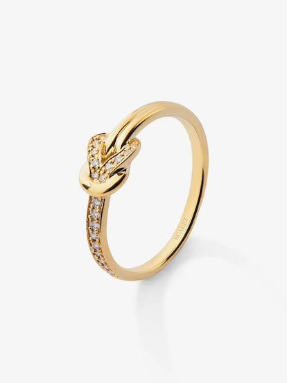 Los nudos simbolizan en la jerga romántica lo infinito e indestructible. Este anillo en oro amarillo de 18K replica su significado con 15 diamantes en talla brillante.