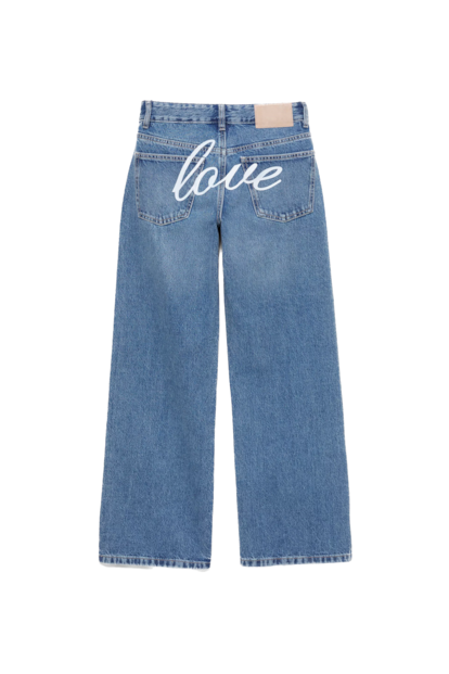 La palabra love luce a bombo y platillo sobre la parte trasera de estos vaqueros rectos, con tiro bajo y un diseño de cinco bolsillos.