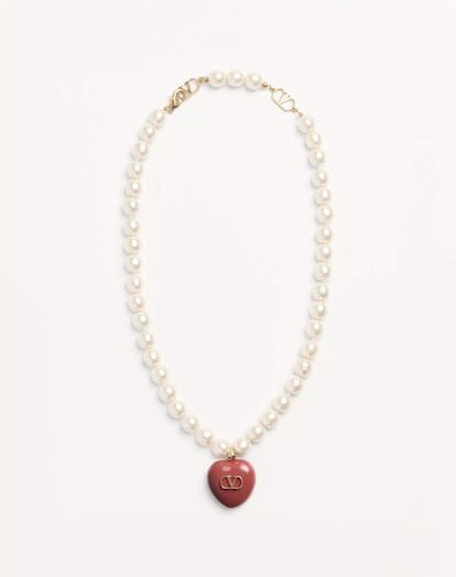 Metal dorado, esmalte, el logo en V y perlas idean el colgante en forma de corazón más deseado de la firma romana.