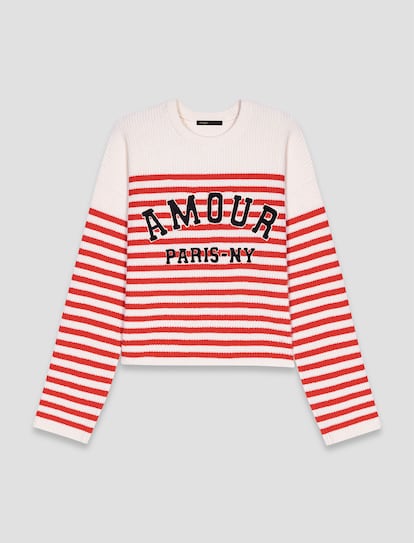 Las rayas marineras, un signo de identidad de la firma francesa, se fijan con el mensaje de Amour en la delantera de este básico para todos los días del año.