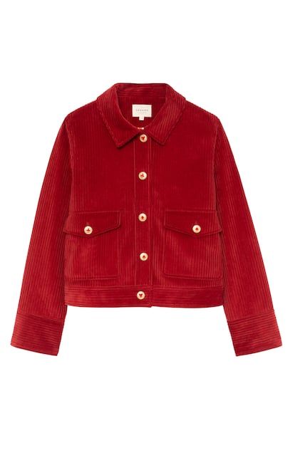 La marca francesa conocida en el mundo entero por sus papeles pintados, textiles y objetos decorativos, se alía con Sézane en una cápsula que contiene prendas tan románticas como esta chaqueta de pana en rojo intenso.