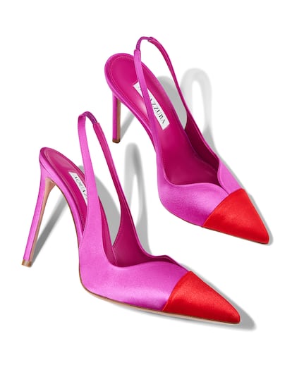 El slingback o zapato destalonado simboliza la feminidad desde tiempos remotos, como este diseño en fucsia y rojo sobre satén.