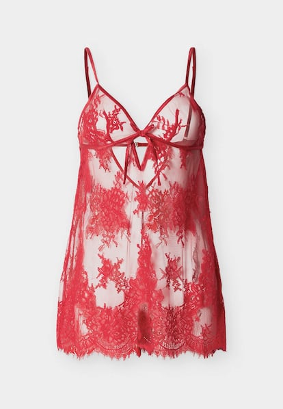 Desde los años 80, la firma británica ha convertido la lencería en un gesto lúdico que regalar o autoregalarse en esta fecha tan señalada. En la imagen, un diseño de encaje en rojo cereza con lazos y tirantes regulables.